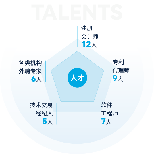 截止2024年,公司擁有各類人才400余人,其中全職博士2人,全職碩士23人,本科188人,???00余人,注冊會計師12人,專利代理師9人,軟件工程師7人,技術(shù)交易經(jīng)紀人5人,南京企服中心等各類機構(gòu)外聘專家6人,公司還和南京大學(xué)、東南大學(xué)、南京農(nóng)業(yè)大學(xué)、南京信息工程大學(xué)、南通大學(xué)、江蘇開放大學(xué)等建立了良好的合作關(guān)系。