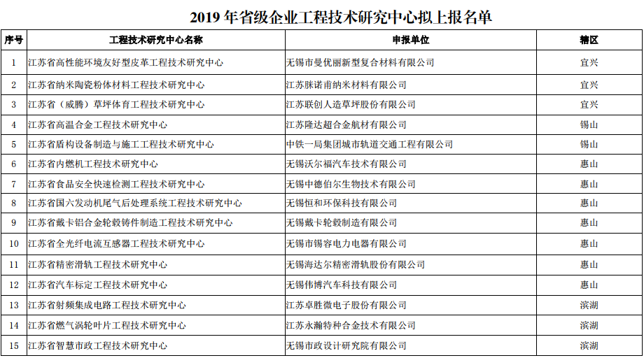 無錫市2019年省級企業(yè)工程技術(shù)研究中心擬上報(bào)結(jié)果的公示